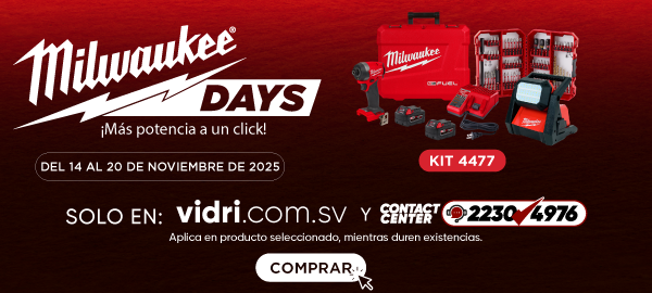 ¡Llegaron los Milwaukee Days! La promoción contiene Kits exclusivos para vidri.com.sv y Contact Center, así como también descuentos de hasta 20% en productos seleccionados de la marca Milwaukee. Productos en descuento con cantidades limitadas, mientras duren existencias. Milwaukee Days solo aplica en vidri.com.sv y Contact Center. Dinámicas con regalías por compras en productos de la marca Milwaukee durante la promoción Milwaukee Days: Por compras de $70.00 a $79.99 en productos marca Milwaukee, llévate gratis una Cuchilla plegable multiuso (SKU 481321). Por compras de $80.00 a $99.99 en productos marca Milwaukee, llévate gratis una cinta métrica magnética (SKU 481322). Por compras de $100.00 a $149.99 en productos marca Milwaukee, llévate gratis un juego de destornilladores de demolición (SKU 481320). Por compras de $150.00 a $249.99 en productos marca Milwaukee, llévate gratis un set de tenazas (SKU 427220). Por compras de $250.00 o más en productos marca Milwaukee, llévate gratis una hielera packout (SKU 140747). Regalías mientras duren existencias; la existencia dependerá de la disponibilidad de cada sucursal. Si en un dado caso, la sucursal en la que se elija retirar no aparece el detalle de la regalía, puede intentar seleccionando otra sucursal que sí tenga disponibilidad. Ante cualquier duda o comentario, favor realizarla en nuestro chat web.